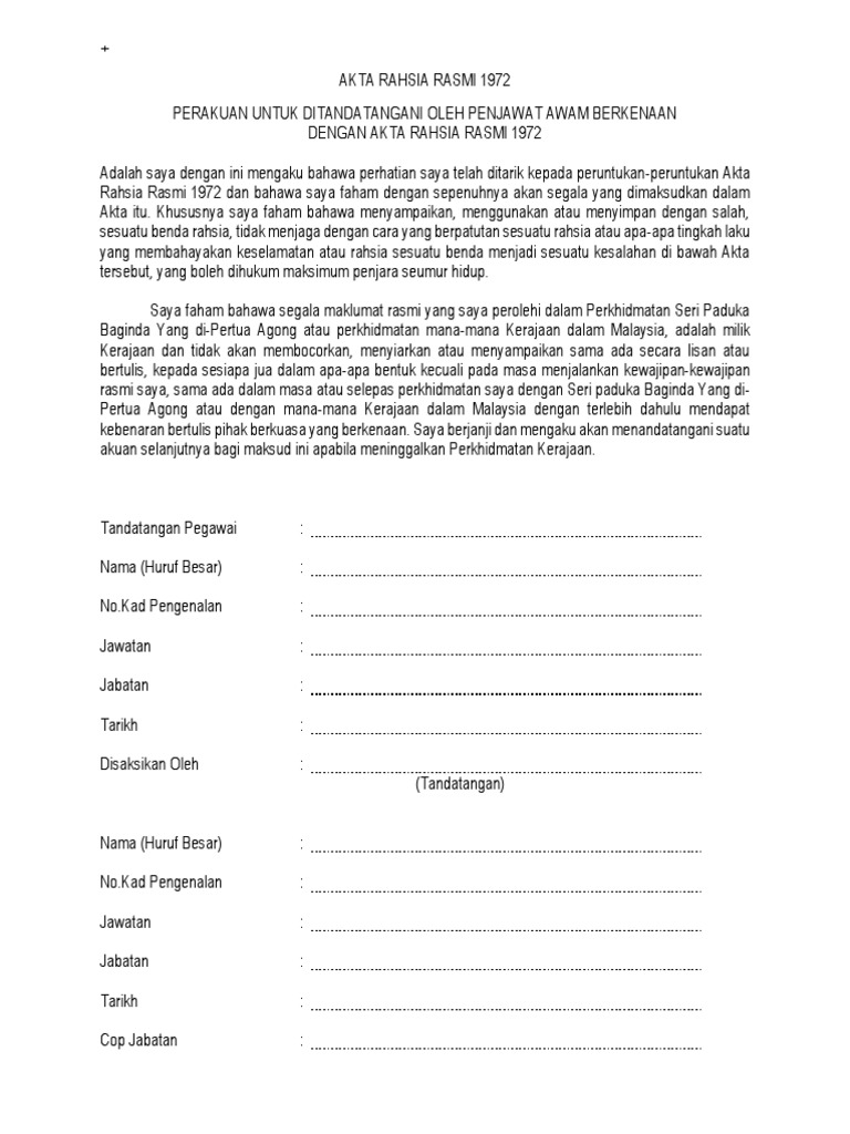 Terhad Lampiran 'D' Perakuan Untuk Ditandatangani Oleh ... from imgv2-2-f.scribdassets.com Semua pindaan hingga september 1996 : If you are the copyright owner for this file, please report abuse to 4shared. Akta rahsia rasmi 1972 (arr) telah lama gagal dinegara. Lihat sahaja mereka berpangkat tinggi/sederhana/rendah, yang pencen terutamanya, bila menerima rawatan di hospital akan mula. Malaysia 2 • par kem. Official secrets act 1972 act 88. Personaliti yang disabitkan di bawah akta rahsia rasmi 1972 • nama perkara tuduhan • 7. Ada yang cakap ezam salah kerana mendedahkan rahsia rasmi, tapi nor salwani tak salah sebab dia tak dedahkan.