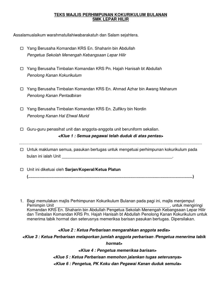 Apabila diumumkan ketibaan para tetamu jemputan. Kita kembali ke segmen teks pengacara majlis. Bismillahirrahmanirrahim ,assalamualaikum warahmatullahi wabarakatuh dan salam sejahtera. Koleksi teks pengacara majlis yang amat berguna kepada para guru di sekolah. Use the download button below or simple online reader.
